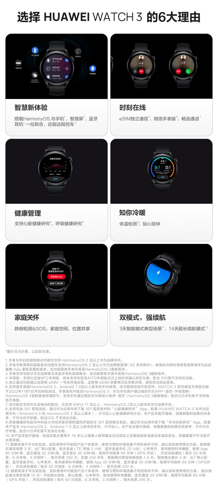 商品名称:华为HUAWEI WATCH 3 华为手表 运动智能手表 黑色 鸿蒙HarmonyOS系统 体温检测eSIM独立通话健康管理