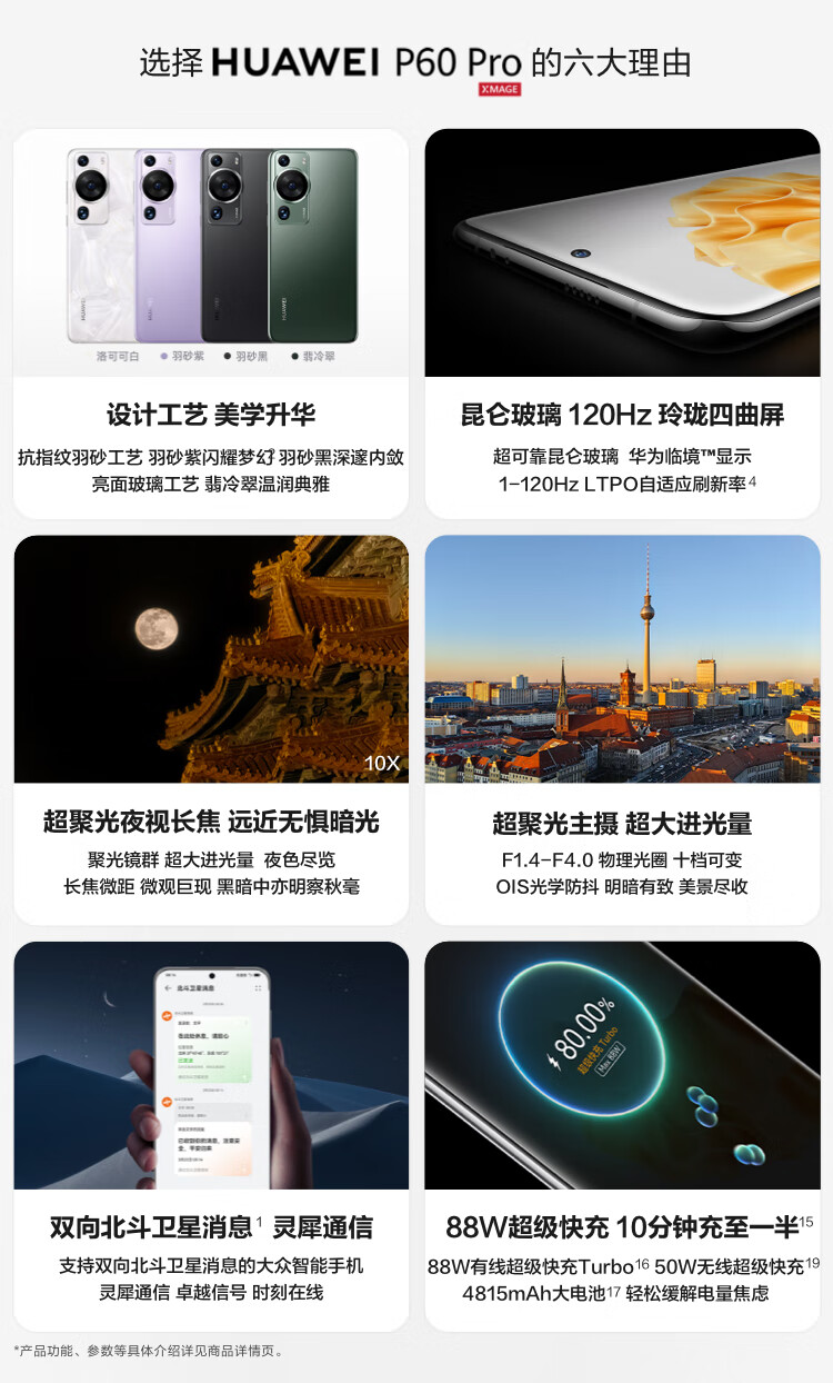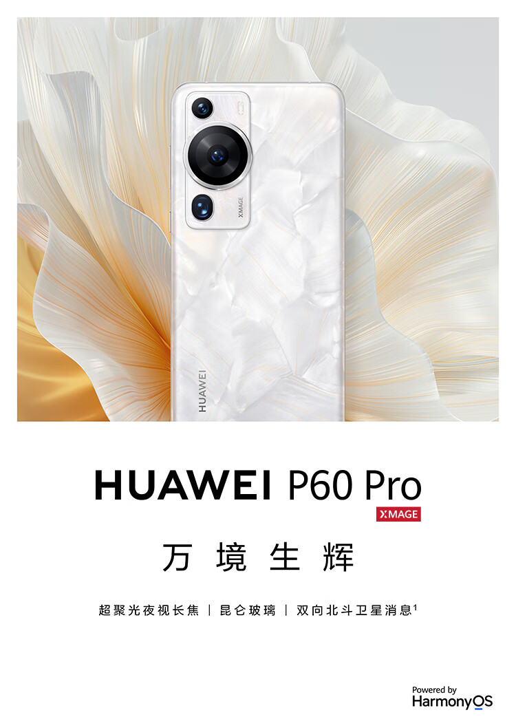 商品名称:华为/HUAWEI P60 Pro 超聚光夜视长焦 昆仑玻璃 双向北斗卫星消息 256GB 洛可可白 鸿蒙智能旗舰手机
